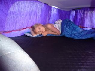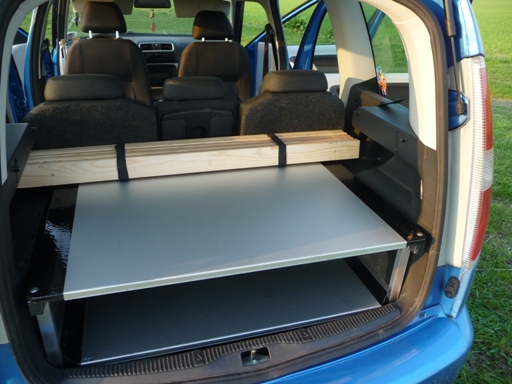 Zum Aufbau des Bettes müssen die Vordersitze nach vorn geschoben und die Lehnen vorgeklappt werden. Mit Hilfe des Lattenrostes entsteht eine Liegefläche von 190 x 130 cm. Die hinteren Sitze sind nicht zum Aufbau des Bettes erforderlich, sie können auch entfernt werden um mehr Stauraum zu schaffen. Fahren mit aufgebautem Bett