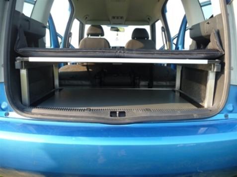 Fahrkomfort ohne Einschränkung Heckgestell mit Filz - beschichteter Bett- und Zwischenablage. Der Lattenrost findet auf der oberen Ablage Platz, alle weiteren Teile des Bettes (Bettschienen und vordere Stütze) werden unter der unteren Ablage verstaut. Bett- und Zwischenablage mit zusätzlicher Beschichtung aus eloxiertem Aluminiumblech (Aufpreis) Der Bettausbau wird komplett im Kofferraum verstaut. Die hinteren Sitze können in der hintersten Position verbleiben. Ausziehbarer Tisch